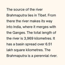 The source of the river Brahmaputra lies in Tibet. From there the river makes its way into India, where it merges with the Ganges. The total length of the river is 3,969 kilometers. It has a basin spread over 6.51 lakh square kilometers. The Brahmaputra is a perennial river.