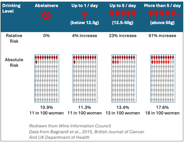 13 in 100 women who have between 1-5 drinks a day will develop breast cancer, or a 23% increase in risk.